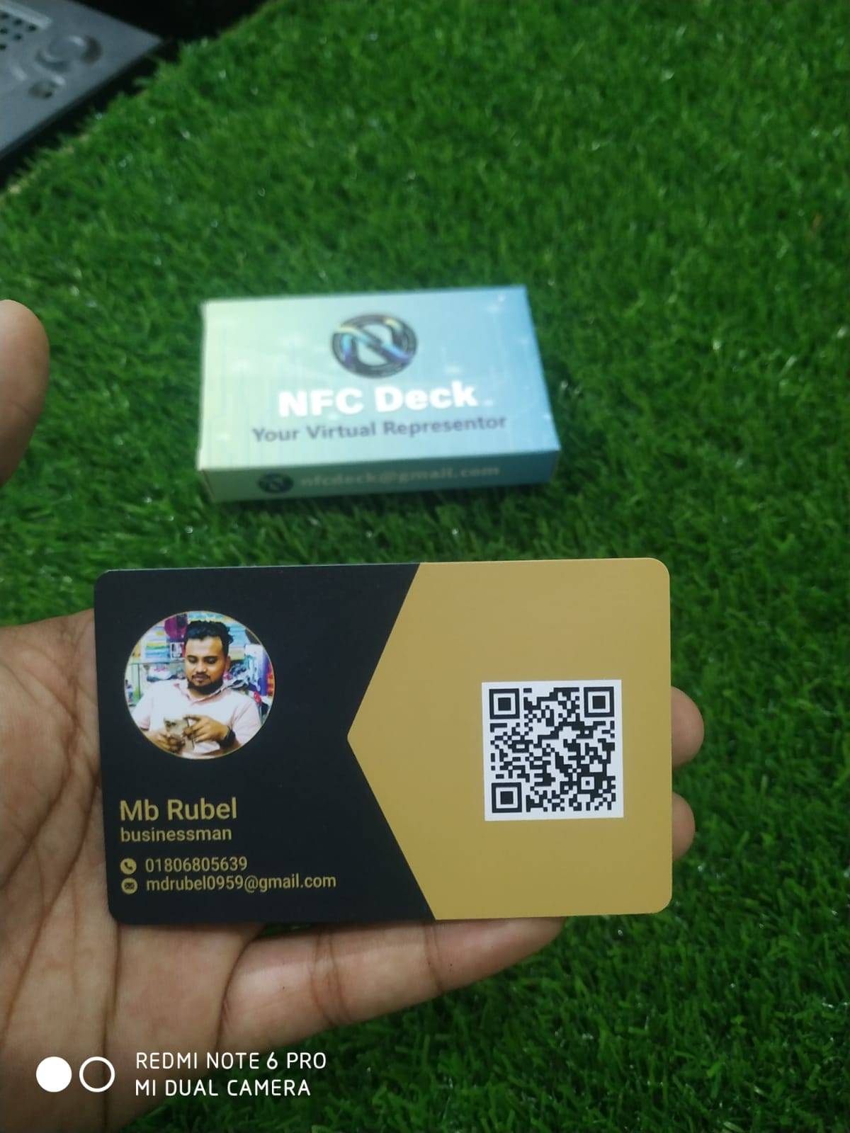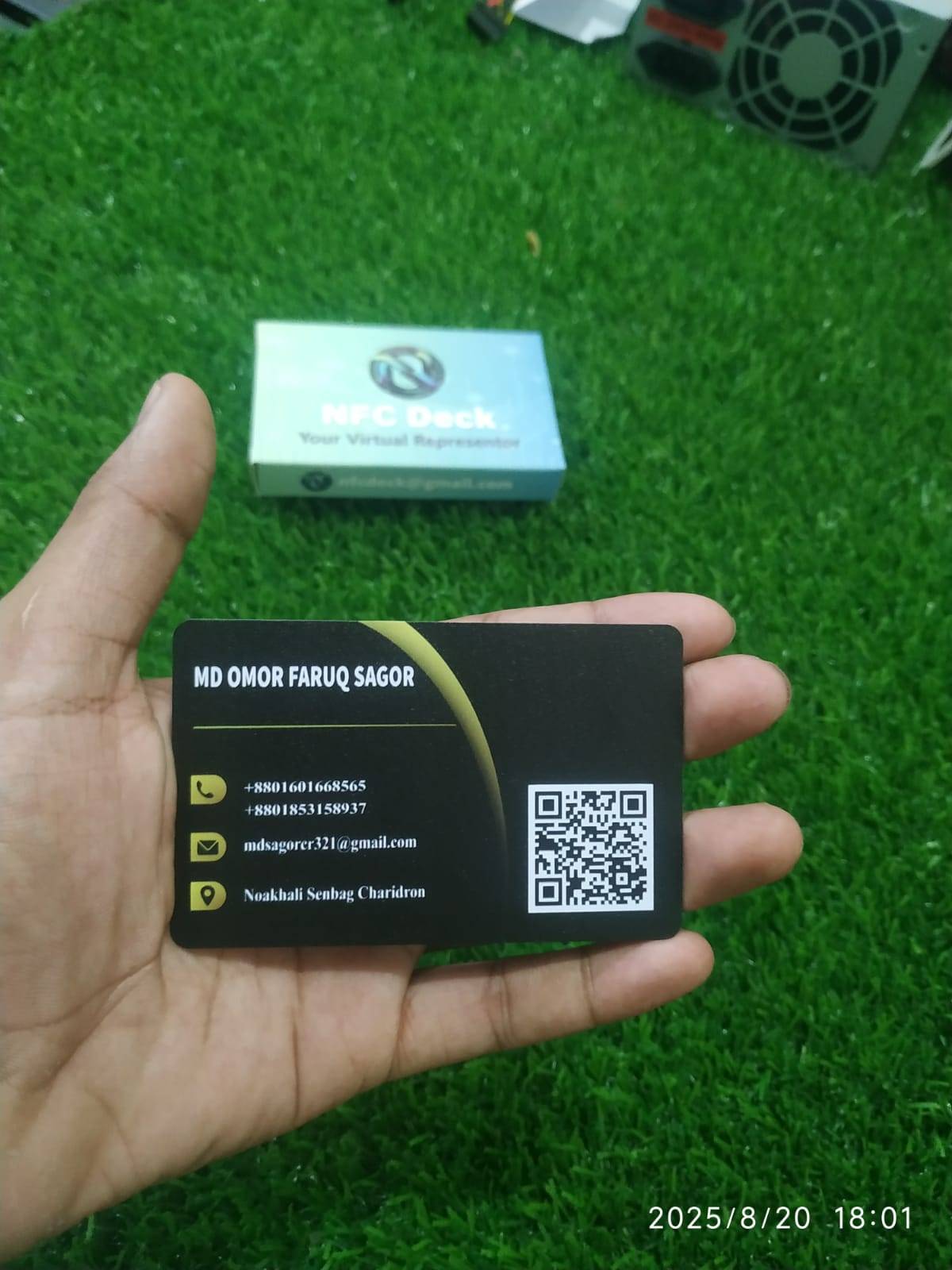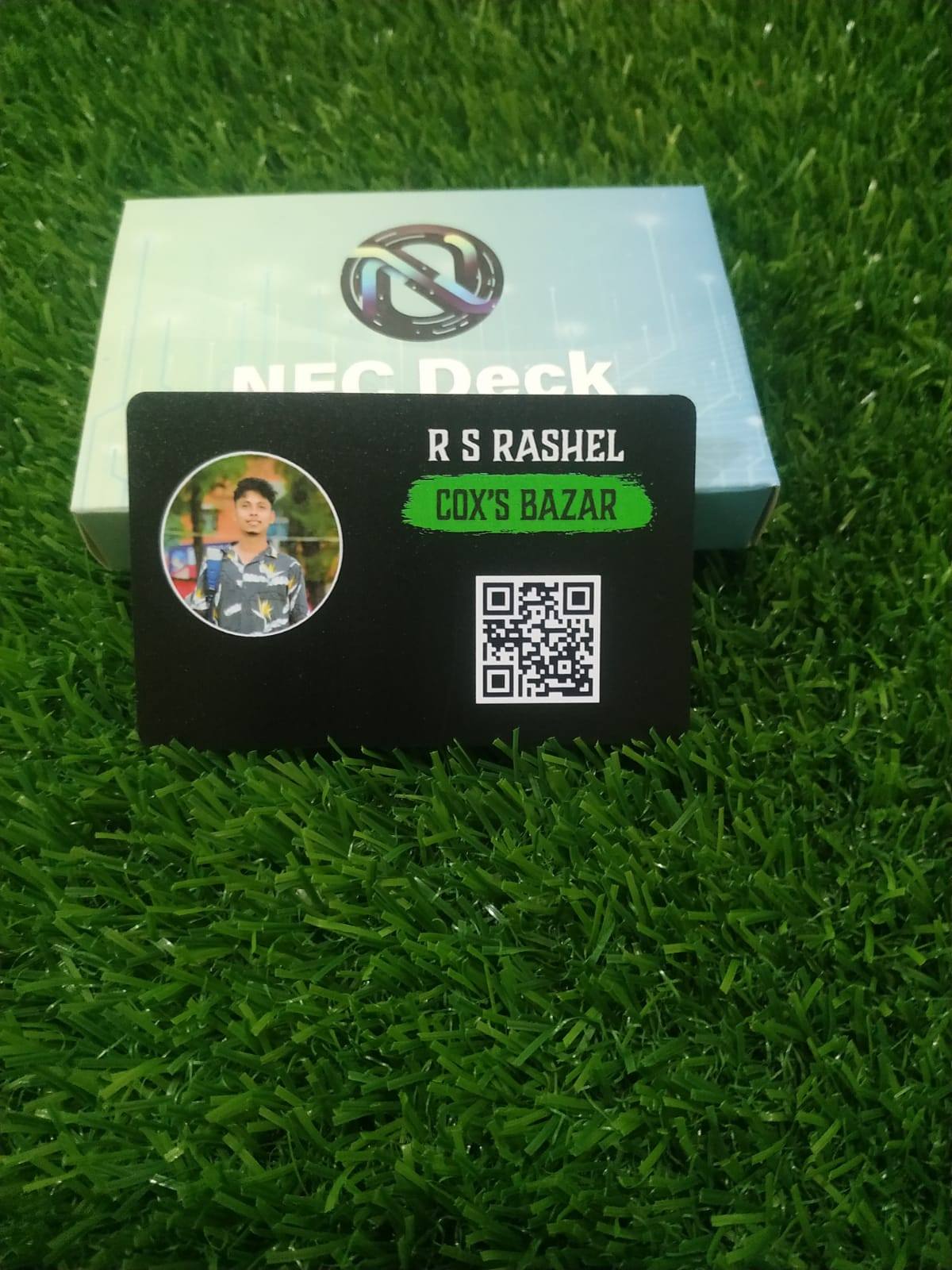 Printed NFC smart business card photos from Bangladesh with NFC tap and Dynamic QR, waterproof PVC, editable digital profiles—real prints and customer shots by NFC Deck.
