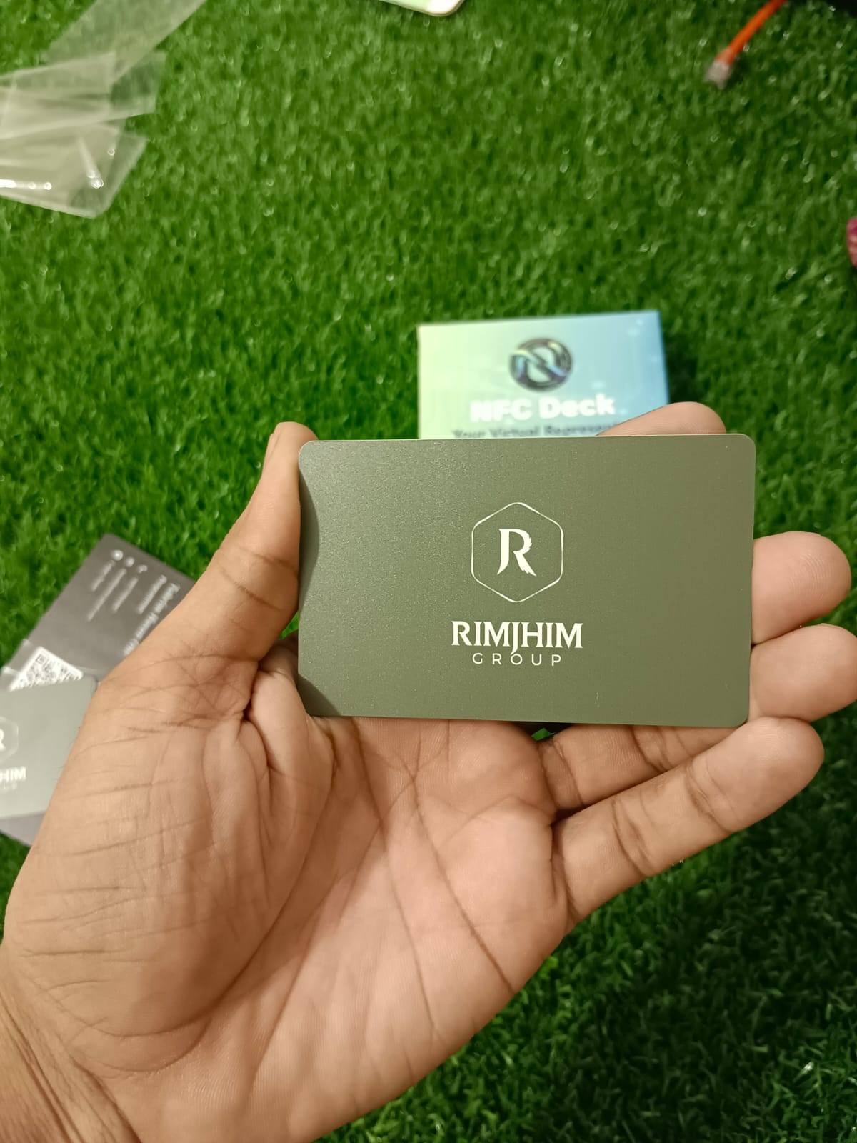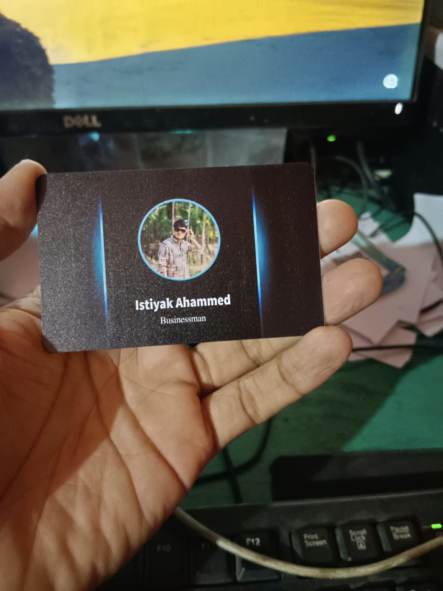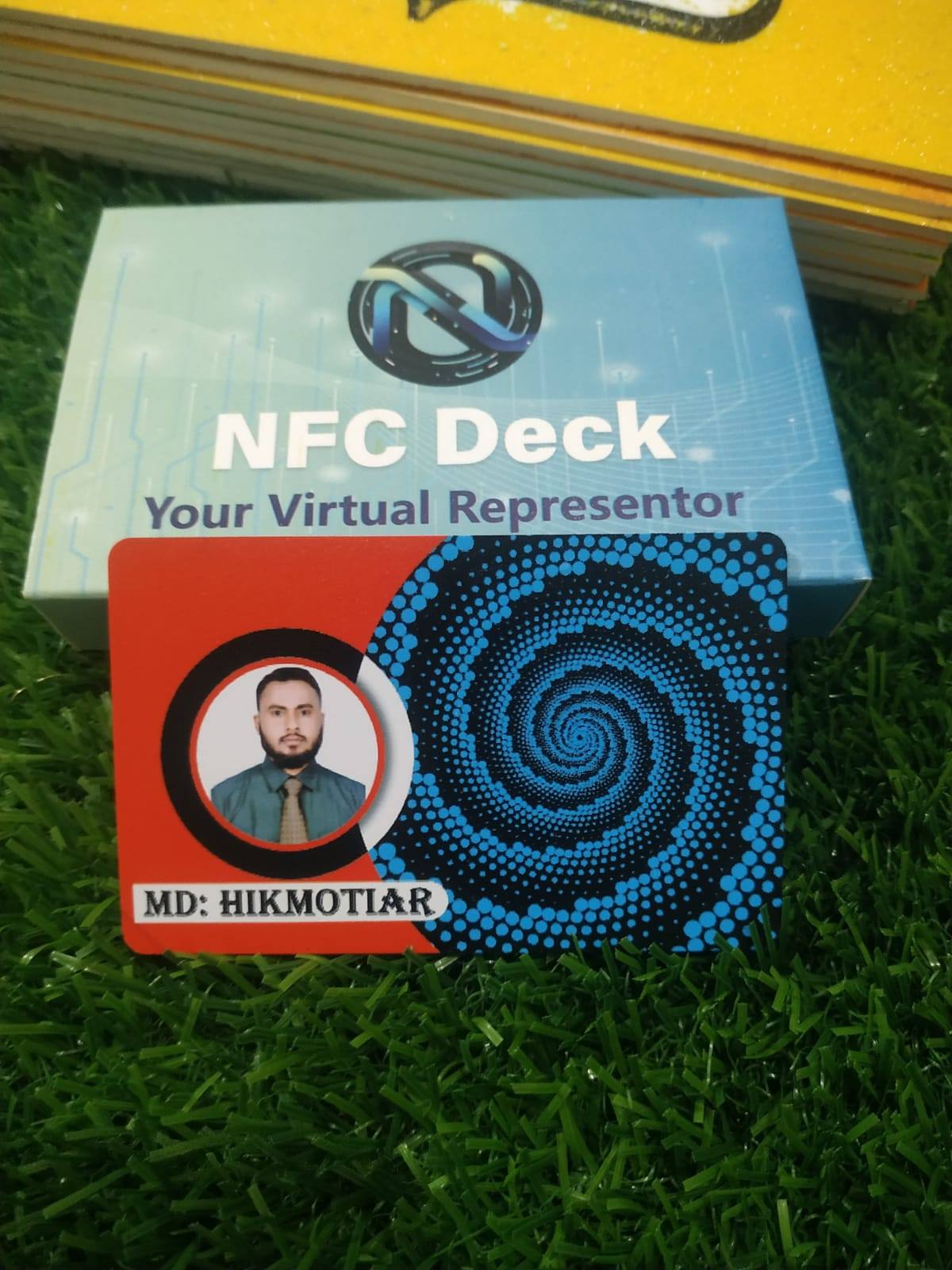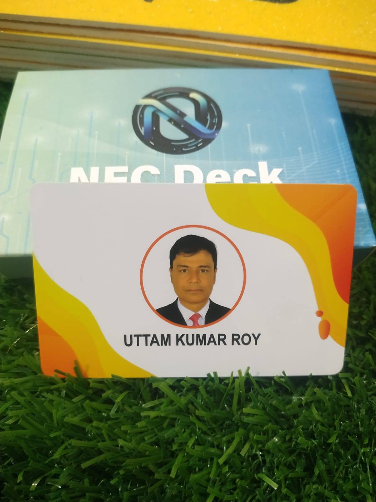 Printed NFC smart business card photos from Bangladesh with NFC tap and Dynamic QR, waterproof PVC, editable digital profiles—real prints and customer shots by NFC Deck.